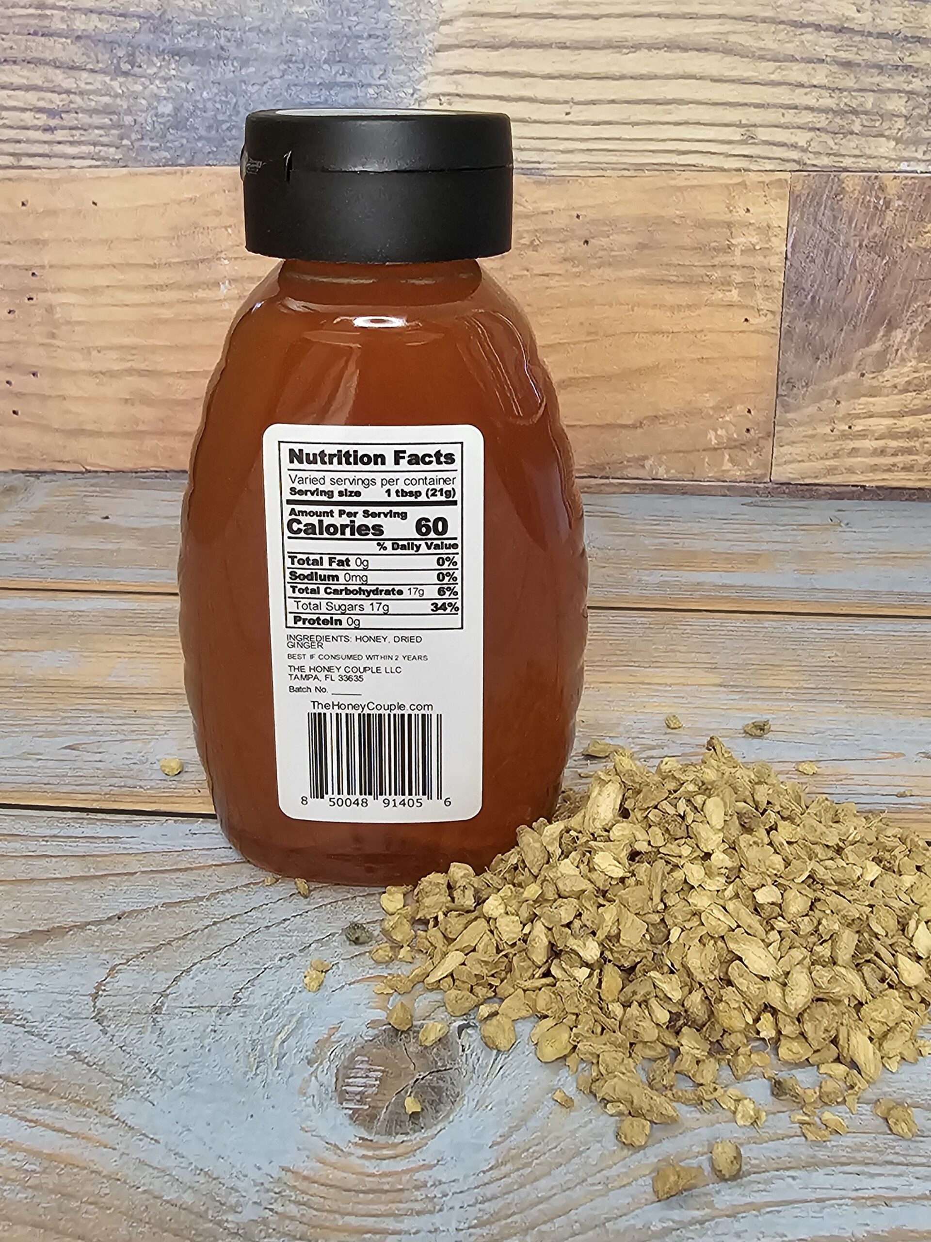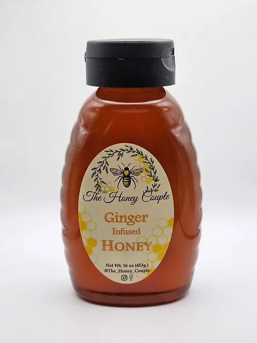 We infuse dried ginger into our wildflower honey. This honey is great in tea or used in cooking with chicken or shrimp.