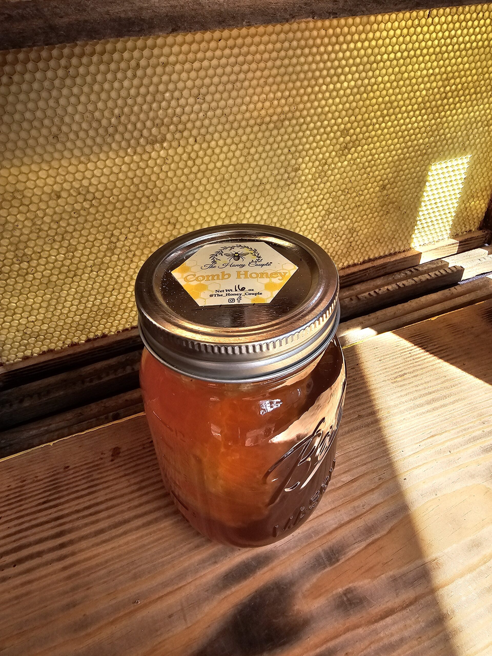 A chunk of comb in a jar of wildflower honey. Delicious!