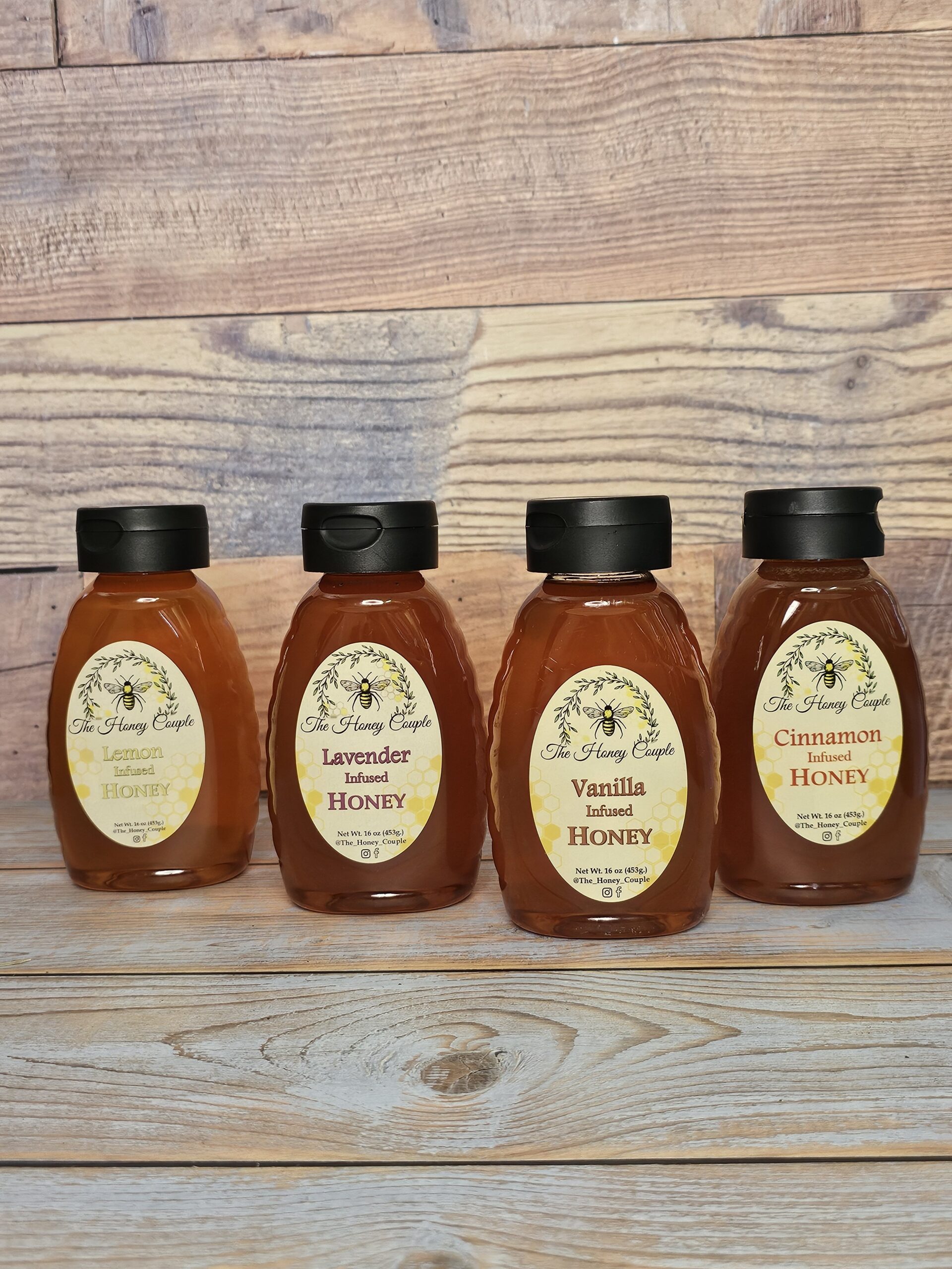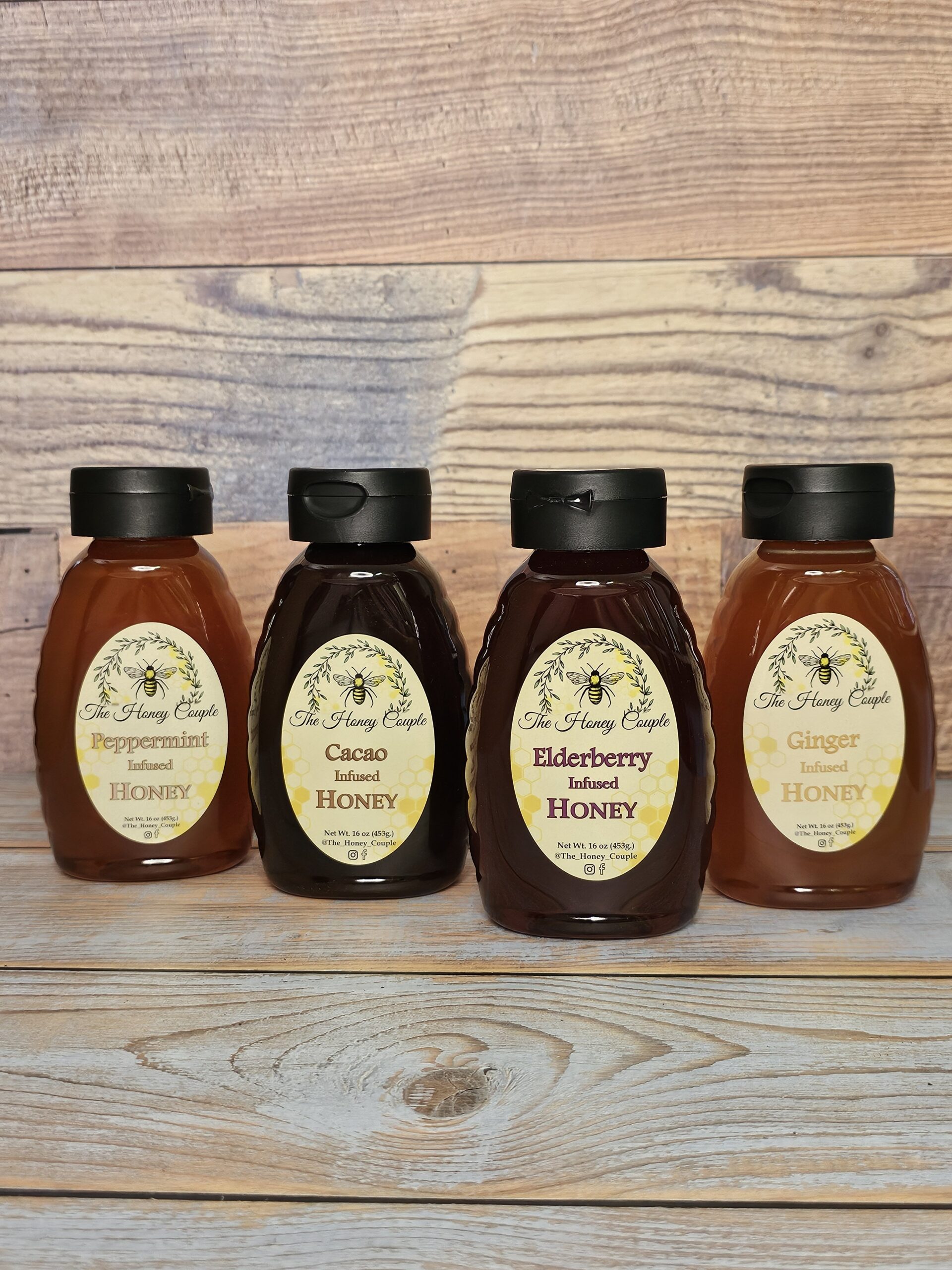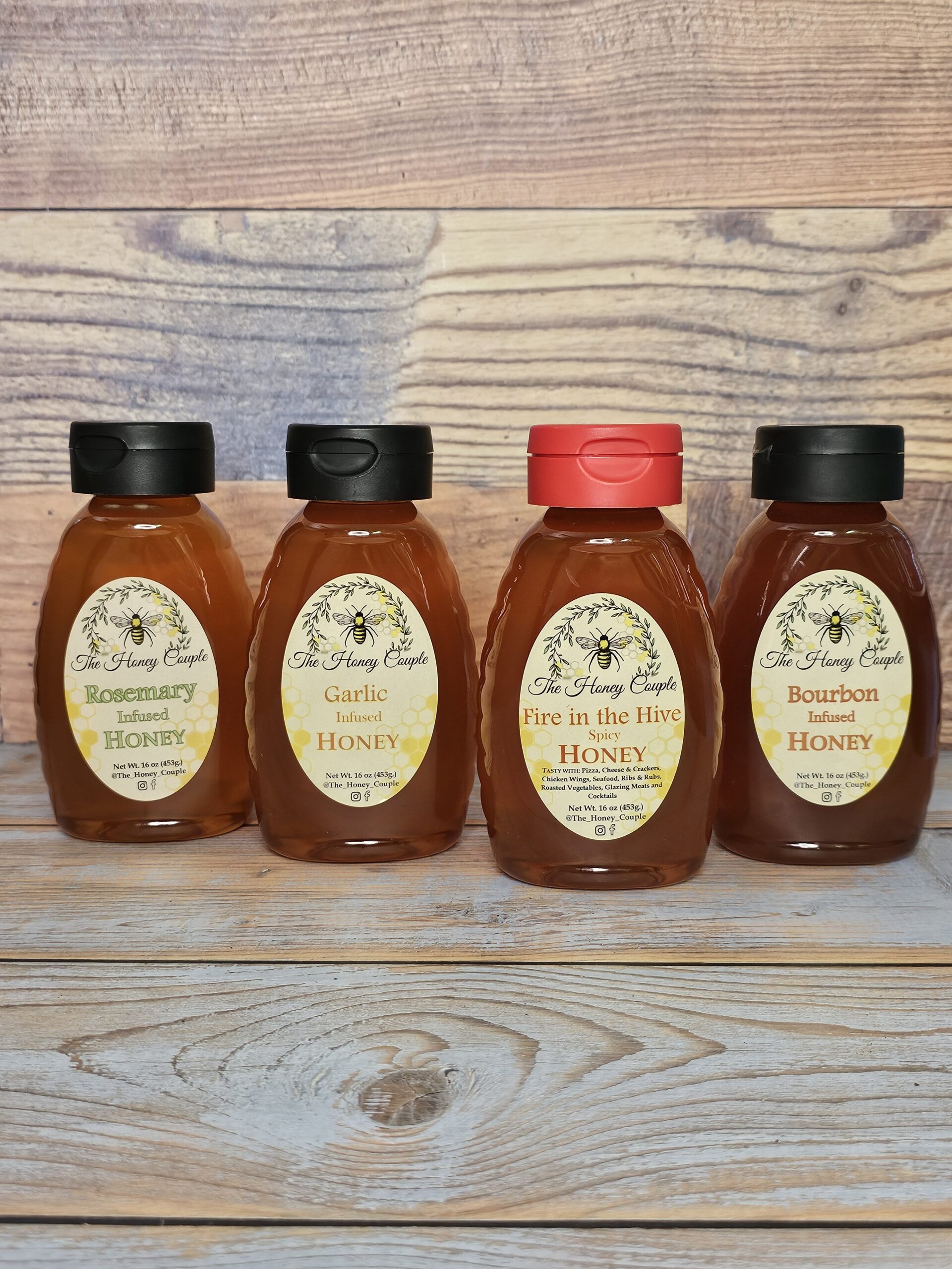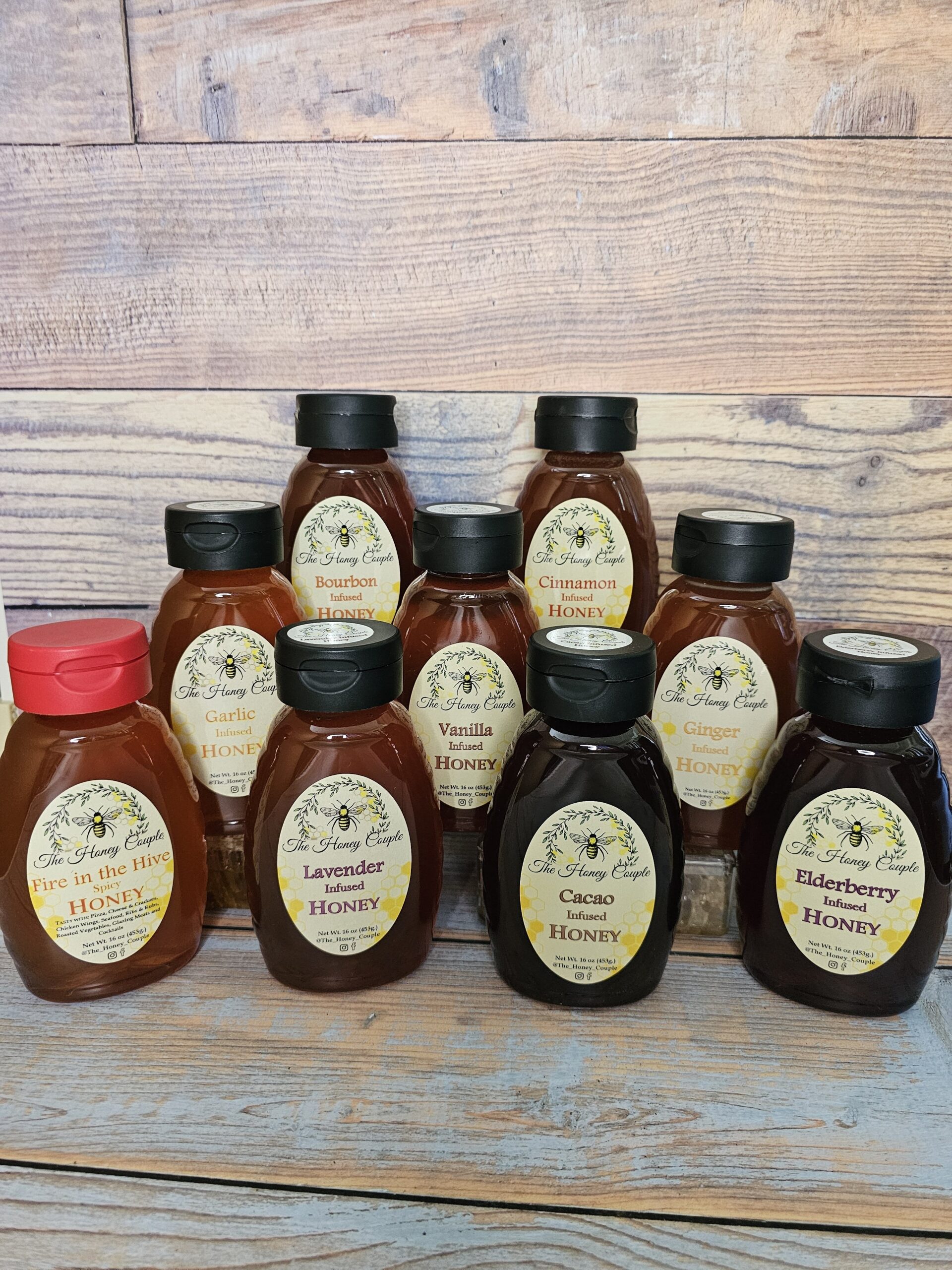 Infused Honey Variety pack of 5 – Your choice of 5 honeys. 16oz bottles includes: Cinnamon, Ginger, Lavender, Lemon, Garlic, Bourbon, Rosemary, Peppermint, Elderberry, Cacao and Fire in the Hive Spicy Honey.